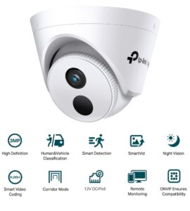 3MP IR Turret Camera. It delivers crisp, high-definition video and uses advanced AI to accurately distinguish between humans and vehicles, ensuring you only receive meaningful alerts. With powerful IR night vision, smart video enhancements, and efficient H.265+ compression,